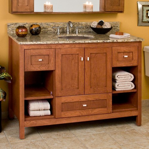 48" Cherry Vanity - Hammered Copper Basin - 1 Faucet Hole - 3/4" Granite Top - Dk. Santa Cecilia . Neatly stow away your lavatory essentials in this large vanity cabinet from the Alcott Collection. The Shaker-style design of this solid American hardwood piece will make a nice addition to any large bathroom. Featuring three drawers, four shelves and a two-door cabinet, this vanity is also is topped with your choice of stunning stone top and hammered copper sink. Shown here in Natural Maple finish. Solid American hardwood construction. Each cabinet is handcrafted with hand-applied finishes. No two cabinets are alike. Wood may change color as it ages and with exposure to light. Over time, small hairline marks may appear in the finishes, over joints and where individual pieces are glued together, adding character to the piece. Features two doors, three drawers and four open shelves for ample storage. Satin Nickel hardware. Vanity set includes the vanity base, stone countertop with backsplash, and a copper undermount basin with bowl clips. Solid 16-gauge copper construction. Sink has a hammered interior and Antique Copper finish. Each sink is handcrafted and is considered an individual work of art. Vanity only dimensions: 48 L x 21-1/8 W (front to back) x 34-1/2 H (± 1/2 ). Available with single hole faucet drilling or 8 widespread faucet drillings. Faucet sold separately. Available in several A-Grade granite, marble and crystallized glass stone colors, thicknesses, and drilling options. See product options. Polished Carrara Marble is from Italy. Also available as vanity cabinet only. See product options listed. All products are warranted by the manufacturer to be free of defects in workmanship, material and finish failure for as long as you own the product. Made in the USA.